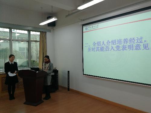 入党介绍人分别对王茜、曹艳的培养经过进行了详细的介绍,对她们转预备表明意见。党支部书记赵锦锦宣读了王茜、曹艳的综合审查意见,以及党内外座谈会情况,并提交党支部大会讨论。与会党员对两位入党申请人的表现情况依次发表意见,给出了中肯和宝贵的建议。