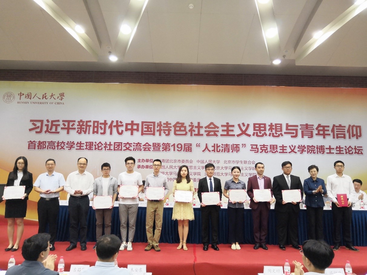 6月9日,习近平新时代中国特色社会主义思想与青年信仰——首都高校学生理论社团交流会暨第19届“人北清师”leyu乐鱼官方网站博士生论坛在中国人民大学世纪馆举行。我校理论社团“leyu乐鱼官方网站习近平新时代中国特色社会主义思想学习研究会”获评“首都高校学习习近平新时代中国特色社会主义思想十佳学生理论社团”荣誉称号,马院研究生二年级学生王蔷蔷及其社团成员撰写的论文《中国社会主要矛盾转变的世界历史意义——基于马克思主义哲学视角》获评交流会优秀论文。