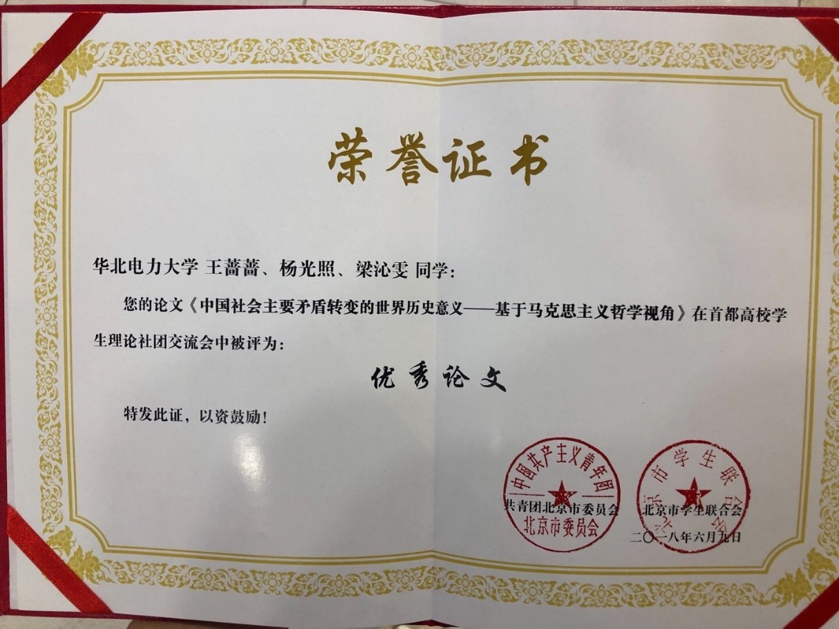 我院王蔷蔷同学及其社团成员所撰写的论文《中国社会主要矛盾转变的世界历史意义——基于马克思主义哲学视角》获评交流会优秀论文