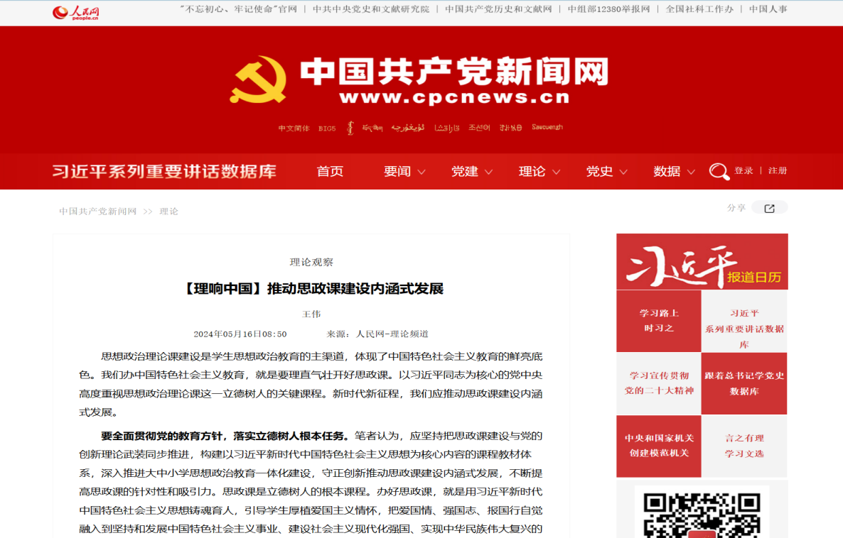 2024年5月16日,leyu乐鱼官方网站院长王伟在人民网理论频道发表《推动思政课建设内涵式发展》文章。