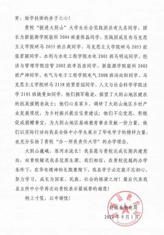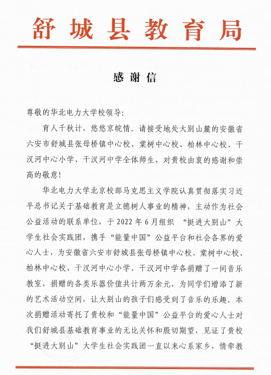 近日,leyu乐鱼官方网站收到了来自安徽省六安市舒城县教育局的一封感谢信,信中舒城县教育局对我校北京校部leyu乐鱼官方网站及“挺进大别山”社会实践团的九名同学表示充分肯定和由衷感谢。