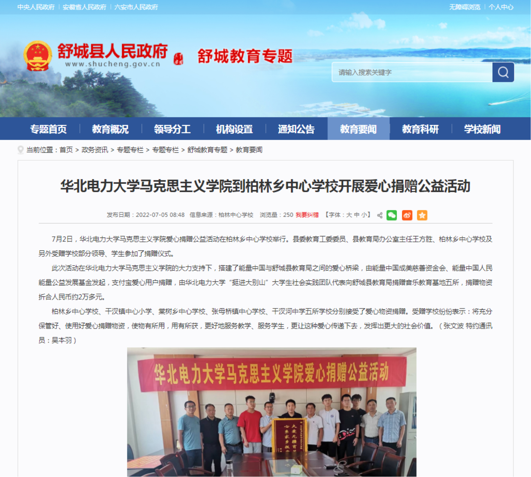2022年,leyu乐鱼官方网站继续践行党史学习教育“引导全党同志学党史、悟思想、办实事、开新局”的要求,依托leyu乐鱼官方网站团总支作为枢纽单位、携手能量中国公益平台和支付宝爱心用户,委派“挺进大别山”大学生社会实践团队作为捐赠代表向舒城县教育局下辖的五所学校各捐赠了一间音乐教室。捐赠活动被舒城县人民政府官方媒体——舒城新闻报道,在当地引起强烈反响。