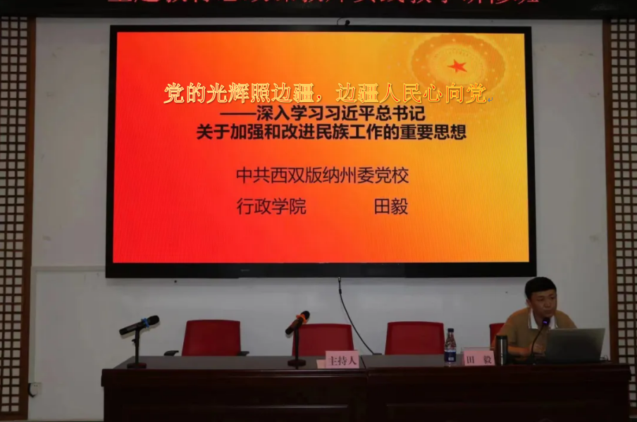 开班仪式后,中共西双版纳州委党校理论教研部主任田毅副教授以“党的光辉照边疆,边疆人民心向党”为题,作了学习领会习近平总书记关于加强和改进民族工作的重要思想专题讲座。
