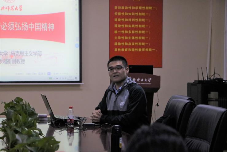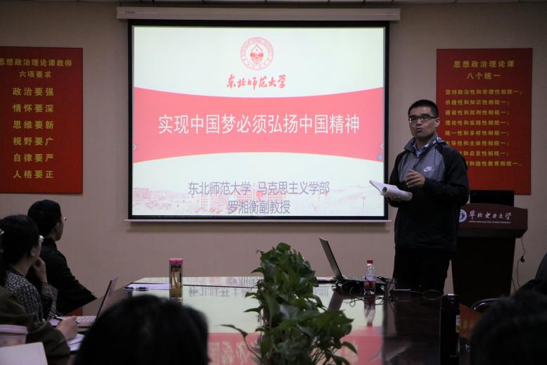 为进一步落实教育部《普通高等学校思想政治理论课教师队伍培养规划(2019-2023年)》要求,提高思政课教学质量和水平,发挥优秀教师的示范引领作用,10月19日下午,leyu乐鱼官方网站邀请首届全国高校思想政治理论课教学展示活动“思想道德修养与法律基础”课一等奖、2021年省高校思政课教师年度影响力提名人物、东北师范大学马克思主义学部罗湘衡副教授以《思想道德与法治》课程中“实现中国梦必须弘扬中国精神”章节进行了示范课教学展示,并分享了自己的教学心得与经验,此次活动由学院党总支副书记武昌杰主持,学院教师代表观摩示范课。