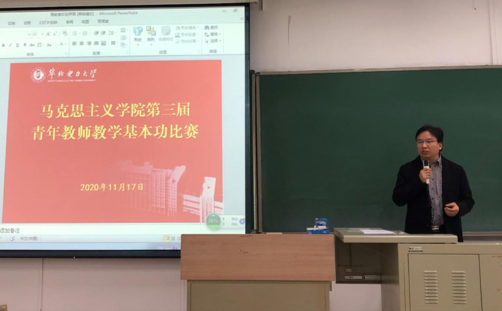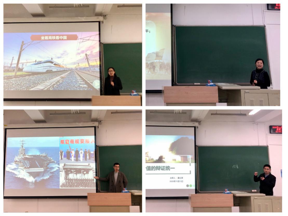 比赛开始,思想道德修养与法律基础教研室的吴宁宁老师首先为大家作了题为《社会主义核心价值观之——“富强”的强劲首发》的教学展示,她从《坐着高铁看中国》的视频引出讲授主题,从价值共识、价值自信、价值自觉三个方面讲述为什么要富强、富强的自信从何而来和如何助力实现富强,最后她希望同学们能够从现在做起,将国家富强梦同个人梦结合起来,既做国家富强的见证者和受益者,也成为国家富强的有力建设者和助力者。中国近现代史纲要教研室的蔡洁老师将多媒体与板书相结合,向大家娓娓道来武昌起义的爆发与南京临时政府的建立,为大家生动再现了那段中华民族推翻封建统治的艰难历程。中国近现代史纲要教研室的王昱淇老师讲述了甲午战争失败的原因及反思,讲述过程中以问题为导向,充分运用详实的数据和视频图文等资料,环环相扣,内容与结构逻辑性严密,为我们理解甲午战争失败的原因提供了全新的视角。马克思主义基本原理概论教研室的盖立涛老师以《真理与价值的辩证统一》为题,为大家讲述了价值的主体性、客观性、多维性、社会历史性等基本特性,并阐述了真理与价值的辩证统一等内容。