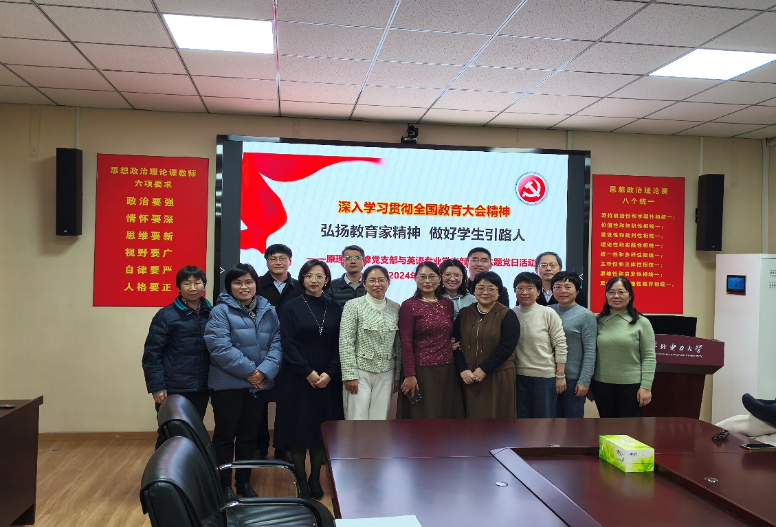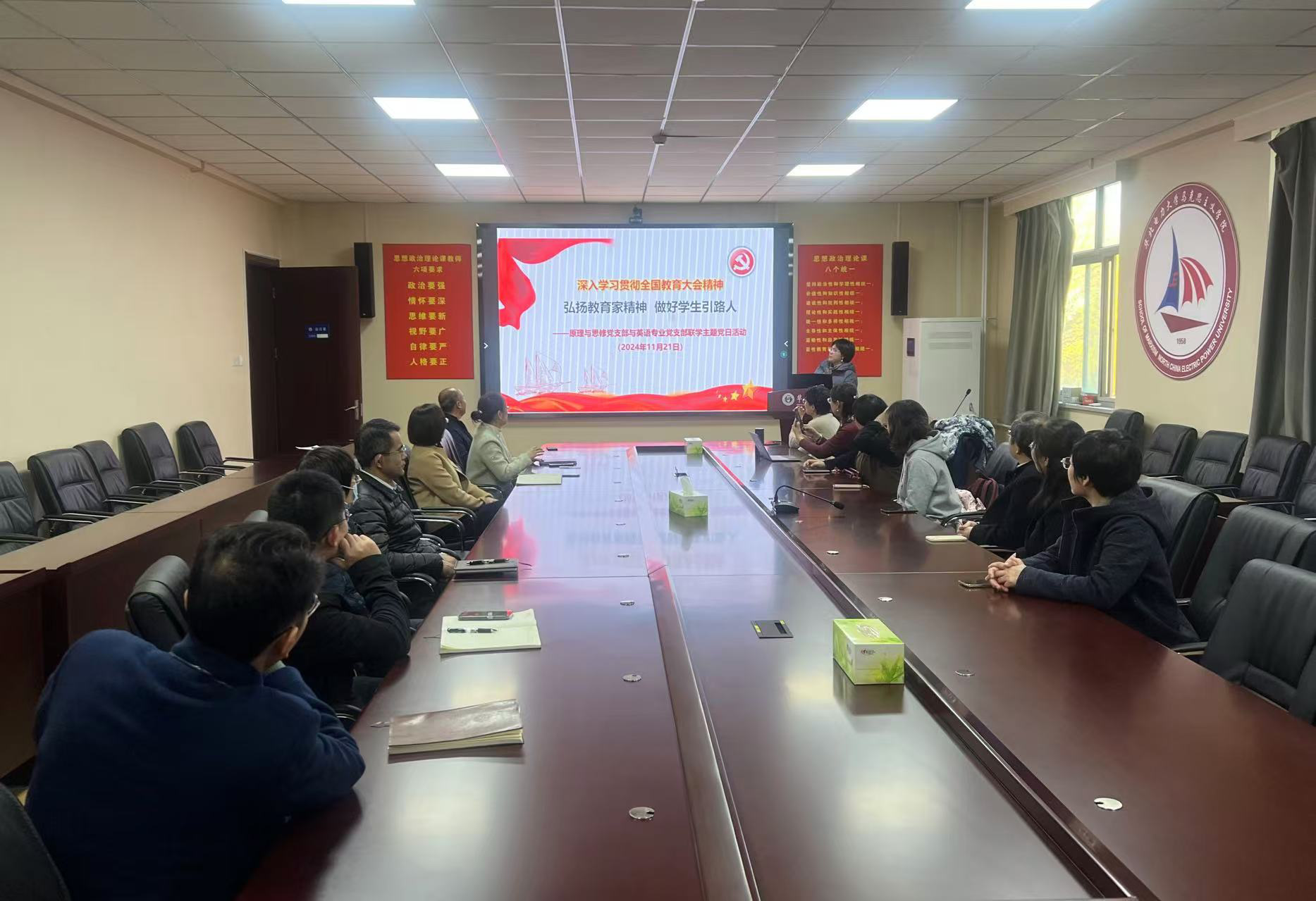 为深入学习贯彻习近平总书记重要讲话和全国教育大会精神,进一步凝聚思想共识、强化使命担当,推动党中央关于建设教育强国的重大决策部署落实落地,2024年11月21日,leyu乐鱼官方网站原理与思修党支部与外国语学院英语专业党支部开展联学共建,进行“弘扬教育家精神 做好学生引路人”主题党日活动,本次活动由原理与思修党支部书记吴宁宁主持,外国语学院英语专业党支部书记郑蓉颖进行总结。