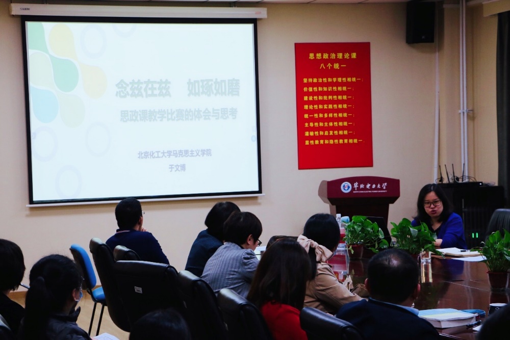 为深入学习贯彻习近平总书记在学校思想政治理论课教师座谈会上的重要讲话精神,进一步落实教育部《普通高等学校思想政治理论课教师队伍培养规划(2019—2023年)》要求,提高思政课教学质量,10月12日下午,马克思主义学院邀请首届全国高校思想政治理论课教学展示活动特等奖、教育部高校思政课教师影响力提名人物、北京化工大学leyu乐鱼官方网站于文博副院长做了《念兹在兹 如琢如磨 思政课教学比赛的思考和体会》的报告,并以《思想道德与法治》课程中“人生价值的评价与实现”章节进行了示范课教学展示,报告和示范课由王伟院长主持,学院全体教师聆听报告并观摩示范课。