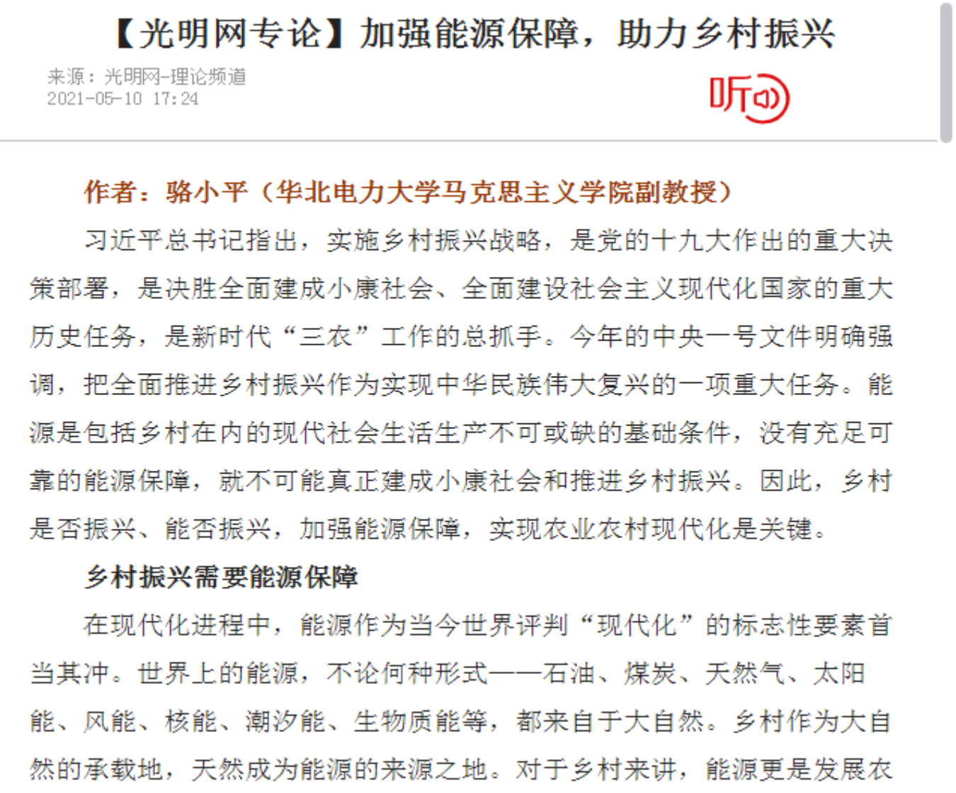 我院骆小平老师在光明网发表理论版置顶文章《加强能源保障,助力乡村振兴》