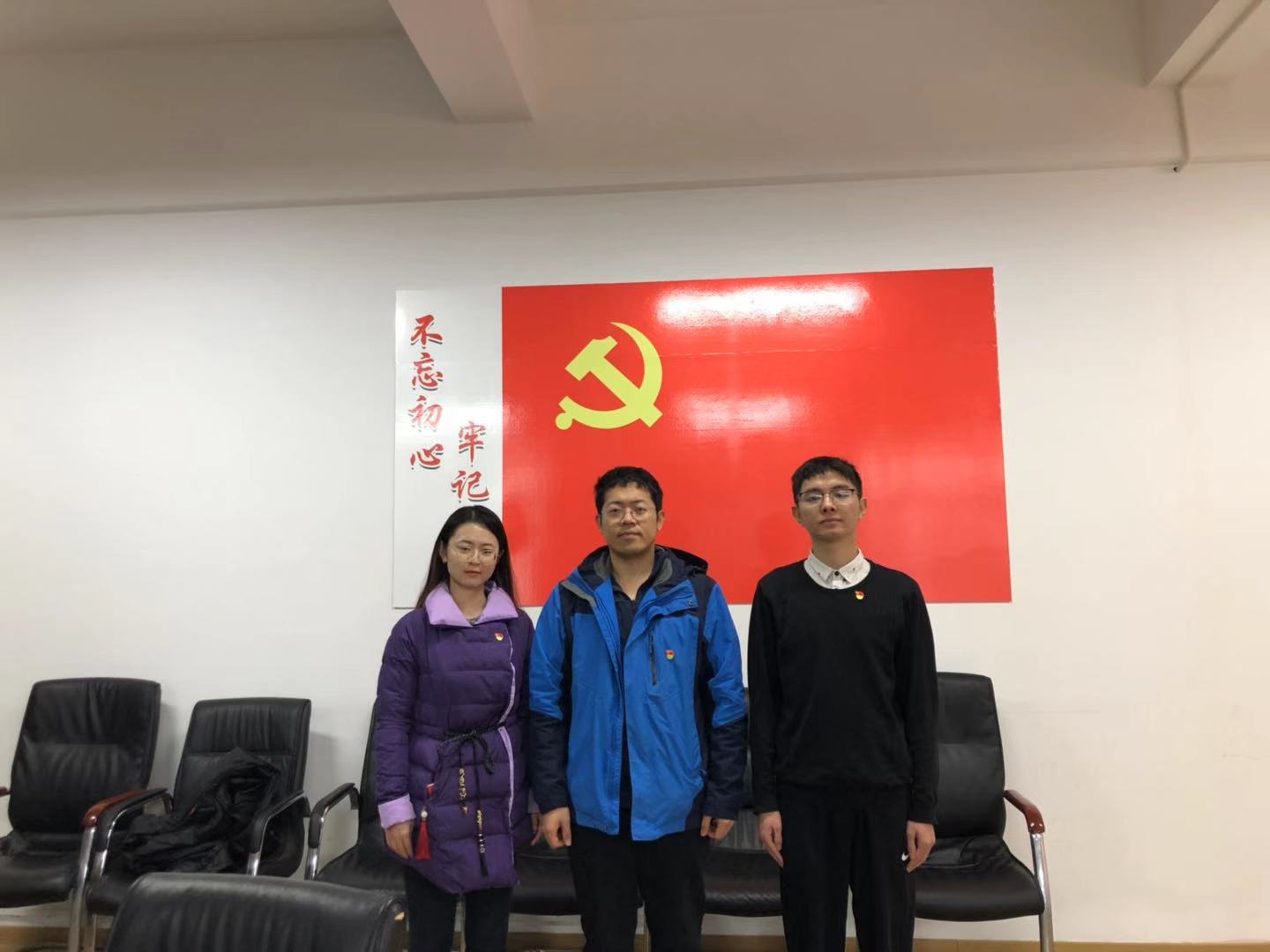 接着,由武昌杰老师为两名新发展的党员同志戴上党徽。