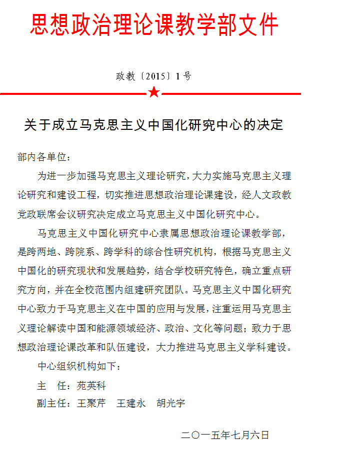 关于成立马克思主义中国化研究中心的决定